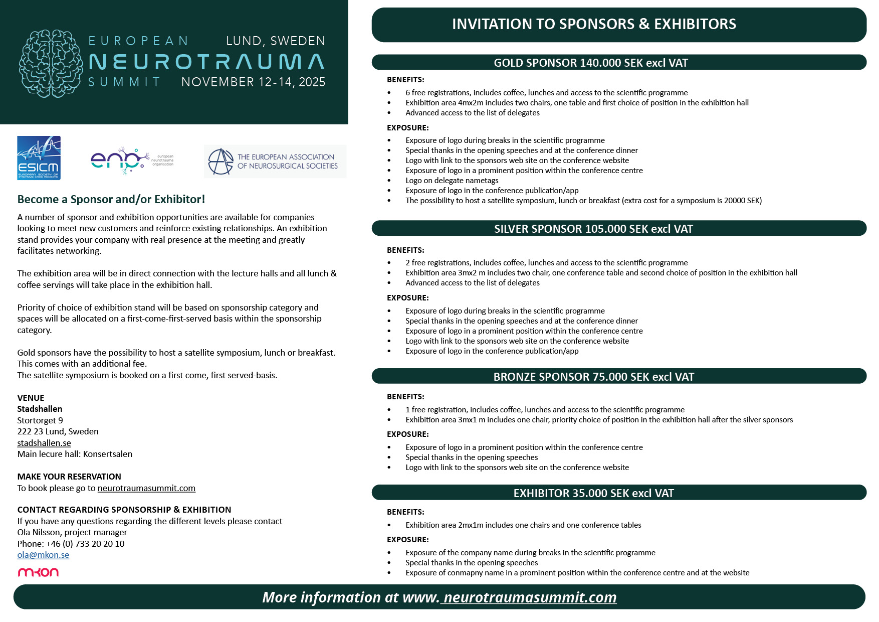 We offer a range of sponsorship packages designed to suit your needs and maximize your engagement. Please find the sponsorship brochure attached or visit https://mkon.nu/ents2025 for more information.