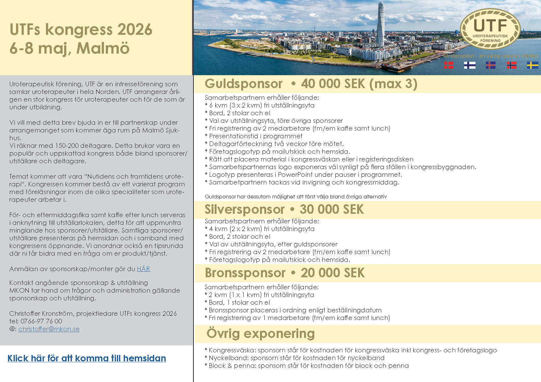 Uroterapeutisk förening, UTF är en intresseförening som samlar uroterapeuter i hela Norden. UTF arrangerar årligen en stor kongress för uroterapeuter och för de som är under utbildning. UTFs kongress 2026 kommer att hållas på Sjukhuset, Aulan, SUS Malmö den 6-8 maj 2026. Mötet är årligt och samlar ca 150 deltagare från hela Sverige. Detta brukar vara en populär och uppskattad kongress både bland utställare/sponsorer och deltagare.